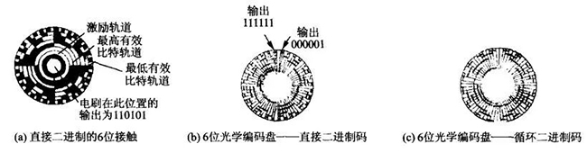 绝对值编码器能给出与每个角位置相对应的完整的数字量输出。由单个码盘组成的绝对值编码器,所测的角位移范围为0〜360°。若要测量大于360°的角位移或者轴的转数,需要多个码盘。因为单个码盘组成的绝对编码器在某一位置输出的二进制码与它旋转n×360°后到达原先位置输出的二进制码是一样的(n=码道数)。换句话说,码盘和与之相连的轴,在上述情况下认为位置是一样的。所以该种编码器输出的是“位置参数”。由于码盘式传感器由敏感元件和码盘所组成,所以对采用不同的敏感元件,码盘的制造和形式也不同。下图示出了三种典型的绝对轴编码盘。最常用的绝对值编码器有接触编码器、光学编码器和磁性编码器。