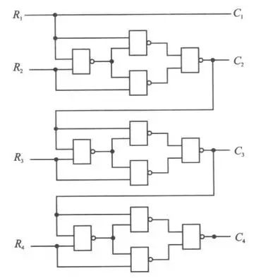 循环码转变为二进制码可由逻辑电路实现。下图是4位并行循环码-二进制码转换器。这种转换器转换速度快,但是所需元件多。
