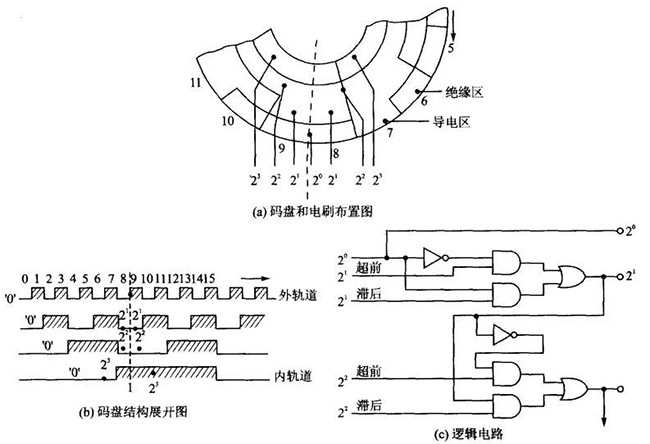 这种方法的原理在于直接运用二进制码的特点。由于二进制码是从最低位逐级进位的,那么最低位变化最快,高位变化逐渐减慢。当某一组二进制码的第i位是“1”的时候,该组码的第i+1位和前组码的i+1位状态是一样的,故该组码的第i+1位的真正输出要从滞后电刷读出;相反,当某一组二进制码的第i位是“0”的时候,该组码的第i+1位和后组码的第i+1位状态是一样的,故该组码的第i+1位的输出要从超前电刷读出。这可以从任一个二进制的数码表中得到证实。
