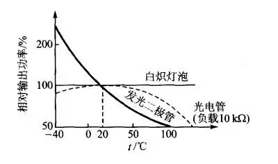 光源是光学编码器的重要组成部件之一,而且是光学编码器最经常发生故障的根源。对光源的选择应当考虑以下几点:第一,光源的光谱要和光电敏感元件相适应。因为光电元件都有自己的光谱特性。国内常用的光电元件大多数对红外线敏感,故光源多用白炽灯泡和发光二极管。第二,要考虑光源的工作温度范围。因为光源的输出功率和温度有关,下图是作为工作温度函数的白炽灯、发光二极管以及通常的光电管敏感元件的相对性能对比图。