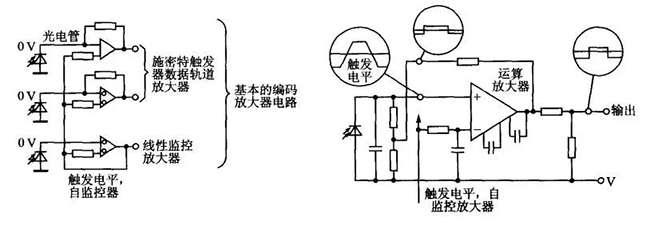 光电敏感元件可采用光电二极管、光电三极管或硅光电池。使用硅光电池时,输出一般为10〜20mV。为了产生希望的逻辑电平,需要后接放大器,而且每个轨道需接一个。放大器通常是由一个集成差动高增益运算放大器组成的,其作用类似一个施密特触发器。因此,需要输入一个预置触发电平,这个预置触发电平单独用一个敏感元件扫描一个完全清晰的轨道来产生,称为监控器电平,它输入到所有数据轨道的放大器中。这样可以克服光源照度变化和电源电平变化产生的输出电平的漂移。