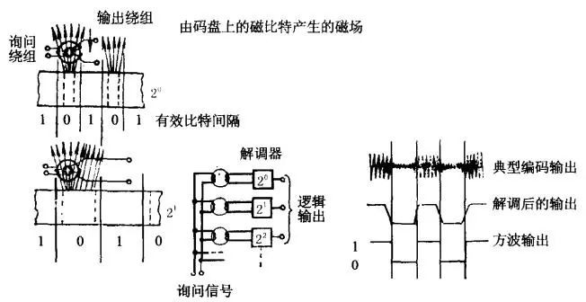 敏感元件是小磁环。每个环上绕有两个线圈,磁环和码道靠近,但不接触。一个线圈通以恒幅、恒频的交流电,称为询问绕组;另一个线圈用来感受码盘上是否有磁场,称为读出线圈或输出绕组。